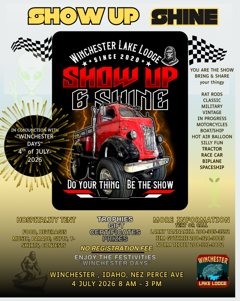 6th annual “WINCHESTER LAKE LODGE” "SHOW UP & SHINE" 4th of July-2026. All are welcome! Saturday, July 4, 2026 8:00 AM 3:00 PM 214 Joseph Avenue Winchester, ID, 83555 United States (map) Google Calendar ICS Bring your cool thing or just come and enjoy, food, beverage conversation, reminisce and relax. No gate or registration fee, tshirts, cars, trucks, farm equpment and alien spaceships always welcome. MORE INFO:LARRY TANNAHILL 208-305-3592JIM GUTHRIE 208-924-9885NORM TIPPIT 208-791-9802